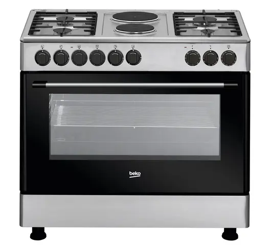 Warranty: 12 months, KEY FEATURES 90x60, 4 Gas + 2 Electric, Euro pool type burners + 2 Electric hotplates, Electric oven, Flame failure safety device, Wide cast iron grid, Multifunction oven -Top and bottom heating element with grill cooking, Easy-to-clean enamel panel Integrated ignition, Mechanical control, Glass lid Double glass oven door - for enhanced ventilation, Easily removable glass oven door for easy cleaning, Baking tray & wire shelf grid, Chicken rotisserie, Adjustable feet, Steam cleaning & Semi inox